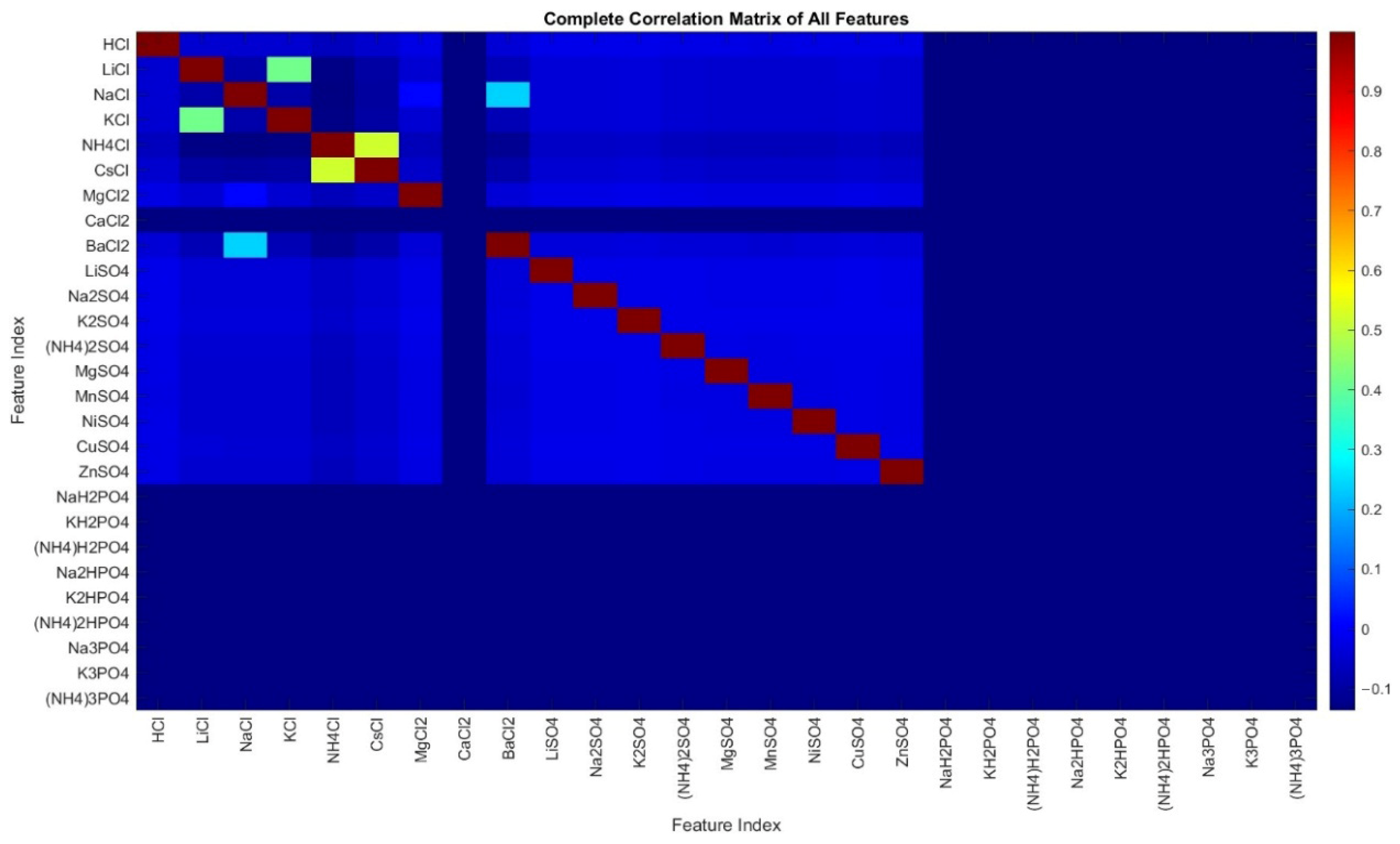Figure 1, the complete correlation matrix is presented to evaluate the effect of dissolved mineral components on the osmotic coefficient in an equilibrium system. The figure shows that most features have low correlation with each other, indicating that each mineral contributes relatively independently to the osmotic behavior of the solution. Therefore, the osmotic coefficient is controlled by the combined influence of multiple ions rather than by a single dominant component. Chloride-based salts show moderate positive correlations among themselves. This suggests that minerals such as NaCl, KCl, and NH