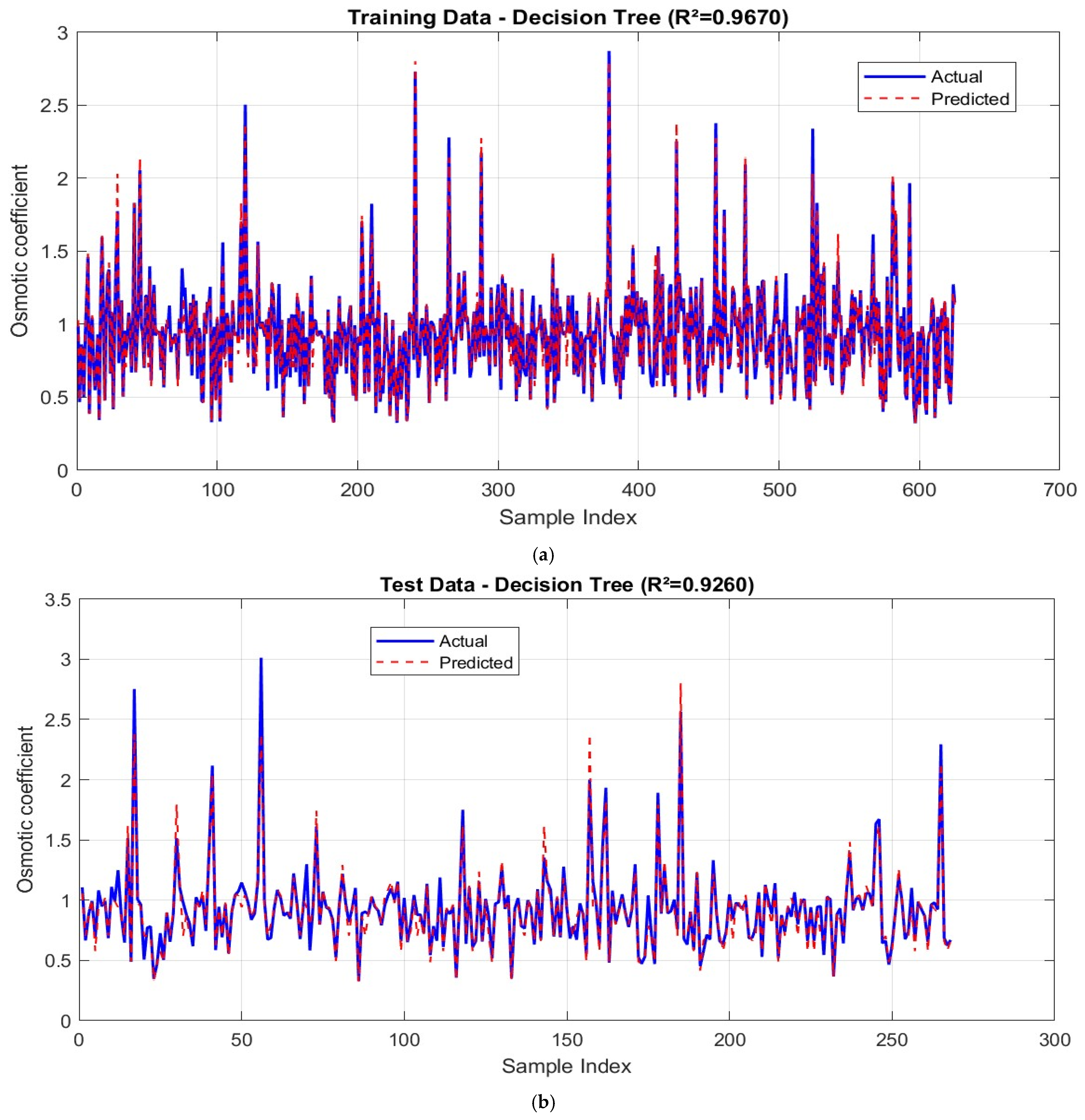 Figure 3, the training and test results for the hybrid GOA-DT approach are shown. This approach was used to predict the osmotic coefficient in an equilibrium system containing inorganic materials. The optimal hyperparameters identified were: a minimum leaf size of 2, a maximum of 199 splits, and a minimum parent size of 2. The model demonstrated high performance on both datasets. On the training data, the model achieved an excellent R