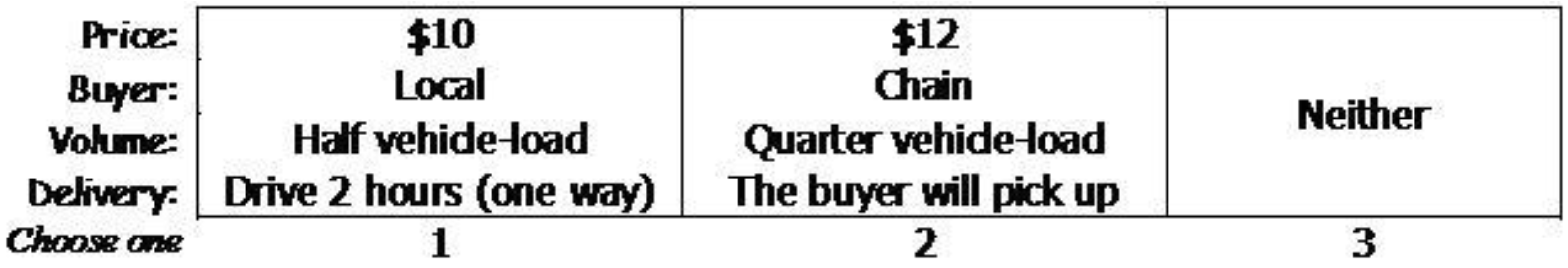Another way to quantify the trade-offs producers make is through a series of designed choice task questions. The producers were asked to consider a situation where they had a vehicle-load of a product that must be sold within the next 10 days, and offers for this product varied by the unit price, volume, the delivery arrangement, and the type of buyer. To simplify, we asked them to assume that they considered $10 per unit as a fair value for the product, but the offer price could vary between $8 and $12. The sales volume could be a full-, half-, or quarter-load of their vehicle’s capacity. The producers were asked to adjust the units of their products so that $10 would be relatively realistic, with examples of a bag of potatoes or a quarter of a lug of peaches. Thus, the number of units per load was not specified. The delivery options were either the producer drove 1 or 2 hours one way to the delivery point, or that the buyer would pick up from the producer’s premise. The buyer could be a locally-based business with at most a few store locations or a chain operation of a national- or regional-franchise. There were 18 choice tasks designed using an orthogonal factorial design, which were divided into two blocks; each respondent was presented with one of the blocks with 9 choice tasks. Figure 1 is an example choice task.