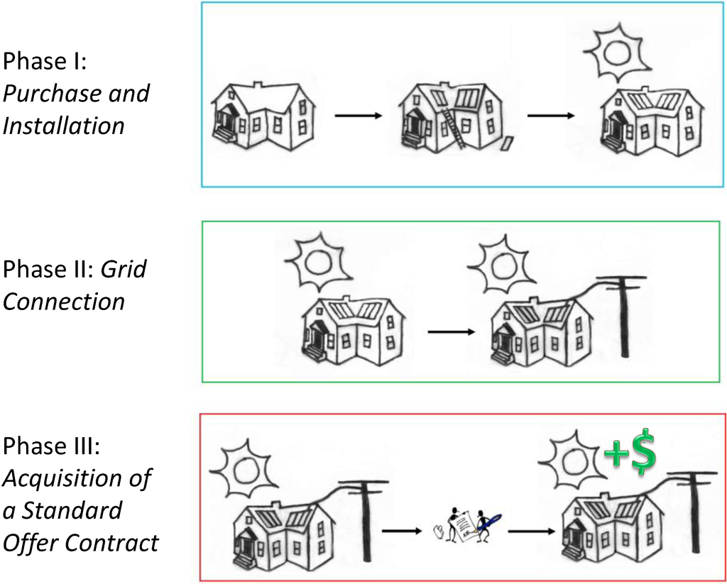 The adoption process consisted of three phases: the purchase and installation of a solar PV system (Phase I), the connection of the solar PV system to the electricity grid (Phase II), and the acquisition of a SOC in order to receive financial remuneration from the province (Phase III). These phases are presented in Figure 3.