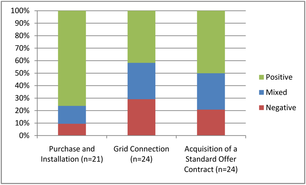 Across the three adoption phases, participant experiences revealed that the grid connection process was the most troublesome, followed by the acquisition of a SOC through the RESOP application process (Figure 4). It should be noted that these experiences were distributed across multiple LDCs and vendors. Six different vendors (for the purchase of the PV equipment) were used by the 24 participants. Participants were distributed geographically across the province, falling under the jurisdiction of nine different LDCs.