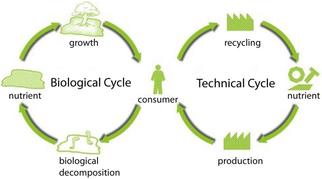 There are a number of ways of looking at waste. The linear concept of design, also called Cradle to Grave—results in physical waste; a final product that is no longer useful and which is therefore discarded and may well affect our environment adversely in some way. In trying to eliminate waste in this sense Cradle to Cradle would require us to redesign products and processes completely, so that materials and processes can be introduced which at the end of their useful life as that product, simply offer themselves as raw material (technical nutrient) for another new product in the technical cycle or as a biological nutrient for the biological cycle. Waste becomes food. An illustration of these two cycles is provided in Figure 1.