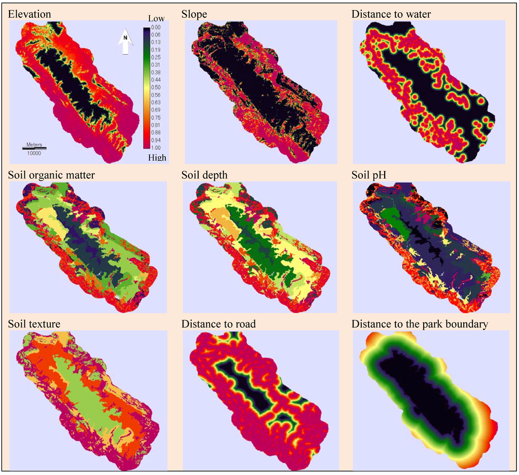 Once the databases were collected, thematic maps were developed for each factor. A digital elevation model (DEM) was constructed using a contour map with a scale of 1:50,000 and an interval of 20 meters. The slope factor was derived from this DEM. Soil texture, soil depth, soil organic matter and soil pH factor maps were extracted from the digitized soil map with a scale of 1:100,000. The distances to water, roads, and the park boundary were generated from the water, road network, and park boundary maps, respectively. The resolution of all raster factor maps was set at 30 m × 30 m.