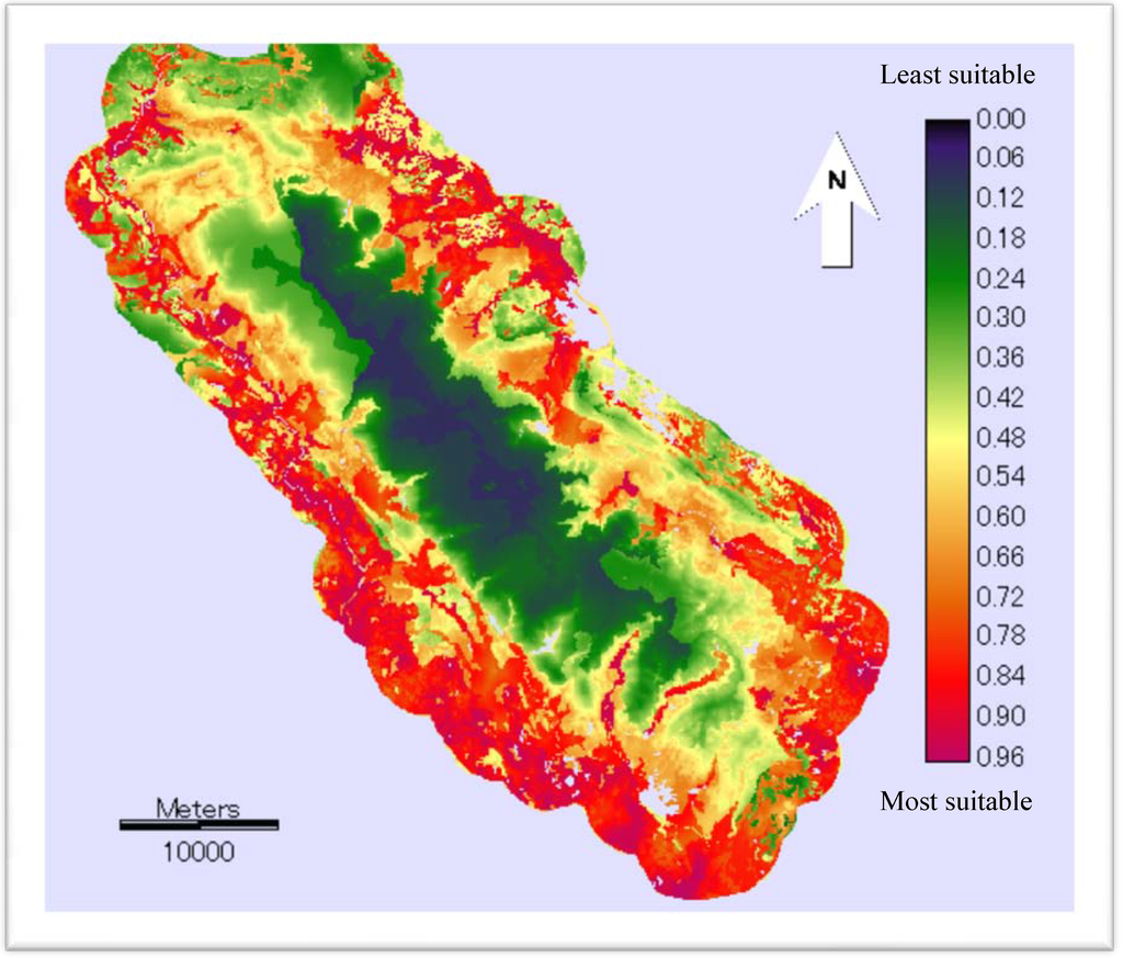 Though the GIS-MCE approach provides an effective framework for land evaluation, the selection of assessment factors and the identification of a suitable range for each factor have a direct influence on the results. In this study, the factors were selected based on the local experts; therefore, they represent a considerable share of the factors relevant to the suitability of growing areas in the region. Moreover, the FMF approach was used to standardize the factors. The FMF approach is useful because it is good at dealing with land-use suitability classes that do not have clearly defined boundaries []. Therefore, the suitability map represents a more accurate result. In particular, the integration of spatial databases and expert knowledge significantly enhances the decision-making capacity when undertaking land suitability evaluations. Moreover, the approach highlights the participatory decision-making process []. Therefore, it can minimize and solve conflicts among competing interests in the area of protected area-buffer zone land-use management.