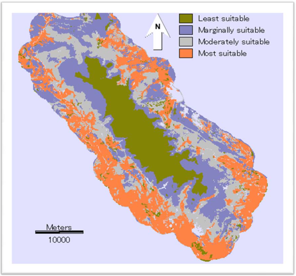 An LSA is a preliminary stage for assessing whether land is likely to be practical and successful for sustainable development of the intended goals. In many cases, cropland has been promoted in areas that are unsuitable in terms of soil conditions. Due to increasing population pressures, agricultural expansion has been increasing in the TDNP region without consideration of the site suitability. To ensure sustainable land uses, there is a great need to allocate farming activities to suitable locations to prevent undesirable effects on biodiversity conservation efforts as well as land degradation in the region. TDNP and its buffer zone management documents were reviewed. The TDNP-buffer zone management emphasizes the integrity of the buffer zone and the TDNP, particularly regarding sustainable land uses in the buffer zone [,]. Buffer zone land-use management affects the protected area because the environmental quality of the buffer zone is critical to maintaining the ecological functions of the protected area []. In the TDNP region, land is an important resource for the enhancement of the living standard of local people near the PA. Land-use management of the buffer zone is facing the issue of balancing agricultural development and forest conservation. The approach and results presented in this study may support land-use management decisions towards a more sustainable PA system. It is assumed that different crop farming strategies should be practiced according to the varying degree of suitability; therefore, we recommend farming strategies for four zones according to the four levels of suitability shown in the land suitability map. Sustainable land-use projects supported by local and central governments should be invested in accordance with each of the zones. We believe that if such farming strategies are introduced according to these zones, they can prevent further deforestation and improve the appropriate use of land in the buffer zone.