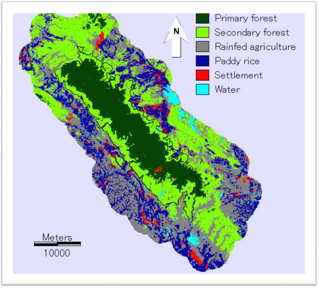 The region is characterized by a tropical monsoon climate with a mean annual rainfall of around 2,600 mm, and most of the rainfall occurs from April to October. The terrain of the area is mostly undulating with steep pediments, and the elevation ranges from 100 to 1,580 meters above mean sea level. The total study area spreads over 141,328 hectares; the area includes the TDNP (35,000 ha) and the buffer zone. The current land uses over the entire study area are primary forest, secondary forest, rain-fed agriculture, paddy rice, settlement, and water. Deforestation due to illegal logging and agricultural expansion has been causing serious land degradation (Figure 2) because most of the 200,000 people residing in the buffer zone of the TDNP generate their incomes from small-scale farming. Aside from agricultural production, few economic activities exist in the area []. Currently, the main challenge for the buffer zone is to ensure food production for the growing population while supporting biodiversity conservation goals. The cropland was chosen for this investigation because the expansion of cropland influences the sustainability of the TDNP.