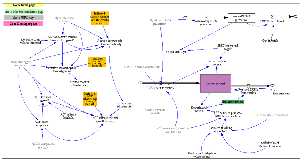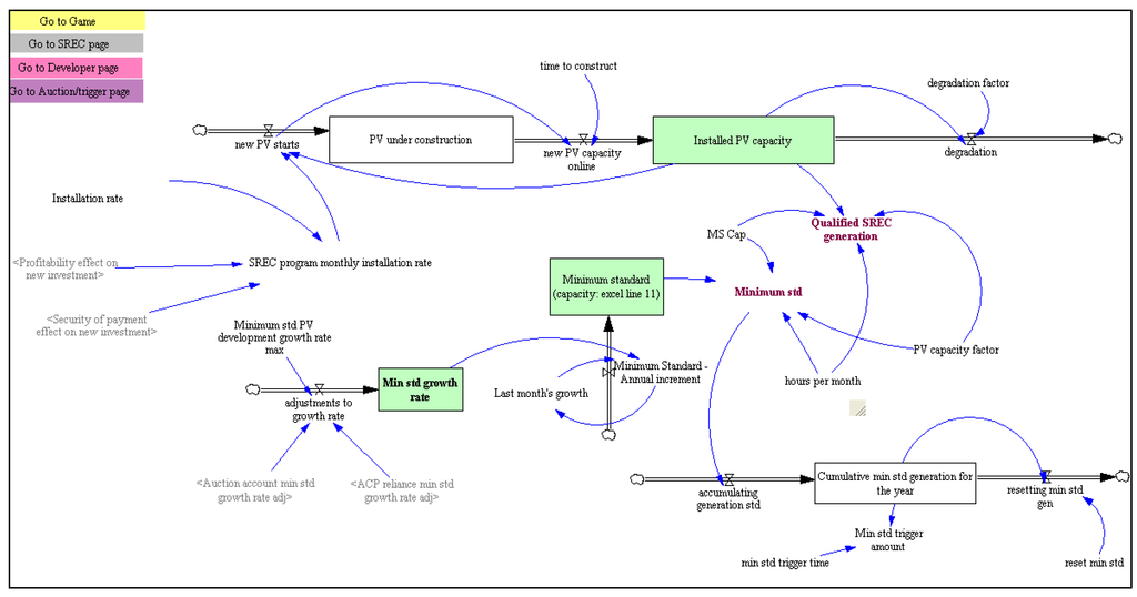 The model was built using Vensim DSS system dynamics software from Ventana Systems. Figure 1 shows a section of the DOER SREC market model with variables for the auction and minimum standard growth rate levers. The boxes with solid outlines (e.g., “Auction account”) represent stocks (parameters that have a specific volume at a point in time) while the arrows going into and out of the boxes that are named (e.g., “SRECs sent to auction”) represent flows (parameters that are rates indicating volume per unit of time). The arrows represent a relationship between parameters and contain underlying equations. Non-stock variables are simply shown as names in the model (e.g., “Evaluation of auction”). Highlighted non-stock variables (“Indicated auction account min std growth rate adj”) represent variables for which the DOER had a particular interest in testing for optimal values. By defining each of the stocks, flows, and relationships, the possible evolution of the SREC market could be projected and visualized and used to more accurately inform policy decisions.