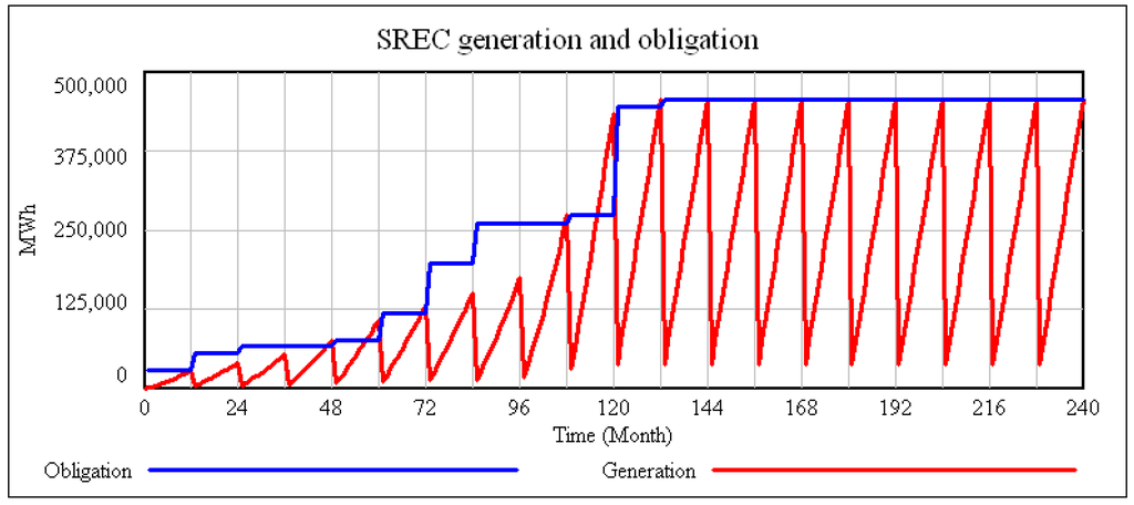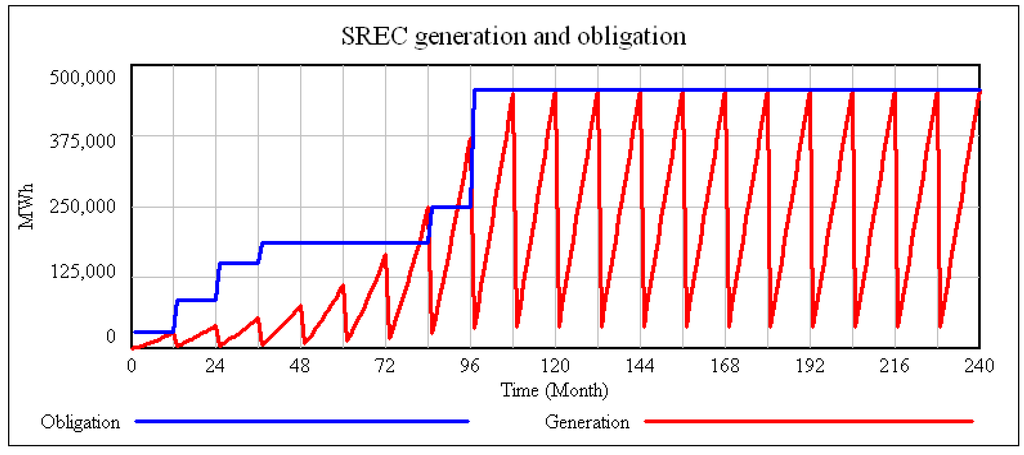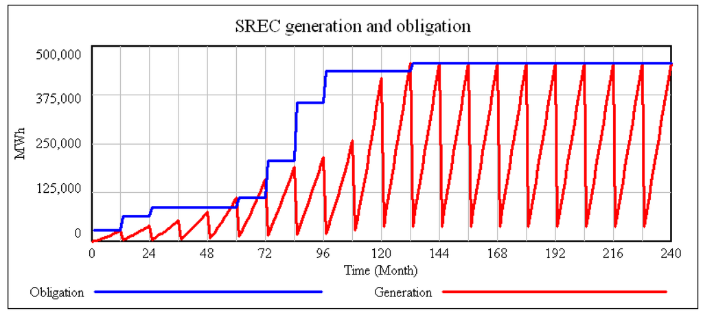 Once the market reaches 400 MW of installed PV capacity, new PV-based generation is not eligible, in other words not “qualified”, to receive SRECs. Figure 2 shows the SREC generation and minimum standard layer of the model.