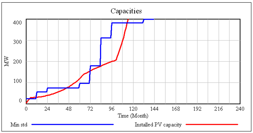 The capacity of installed PV (in MW) and the minimum standard over time are shown in Figure 4. The target capacity of 400 MW is reached in just under 10 years in the base case, although the target SREC generation is not achieved until the following year because some installations that come online during the course of the year (rather than at the beginning of the year) do not produce a full years’ worth of generation.