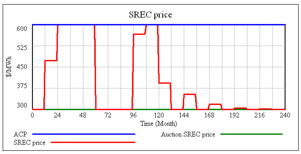 While the model is not meant to predict specific prices, SREC price will likely rise to the ACP price fairly quickly after the start of the program then decline to the auction price as solar installations catch up to the standard, then will rise and drop again as SRECs oscillate between over- and undersupply. This oscillating price pattern has been seen in other REC modeling efforts [13] and is due to the time lag to bring new installations online.
