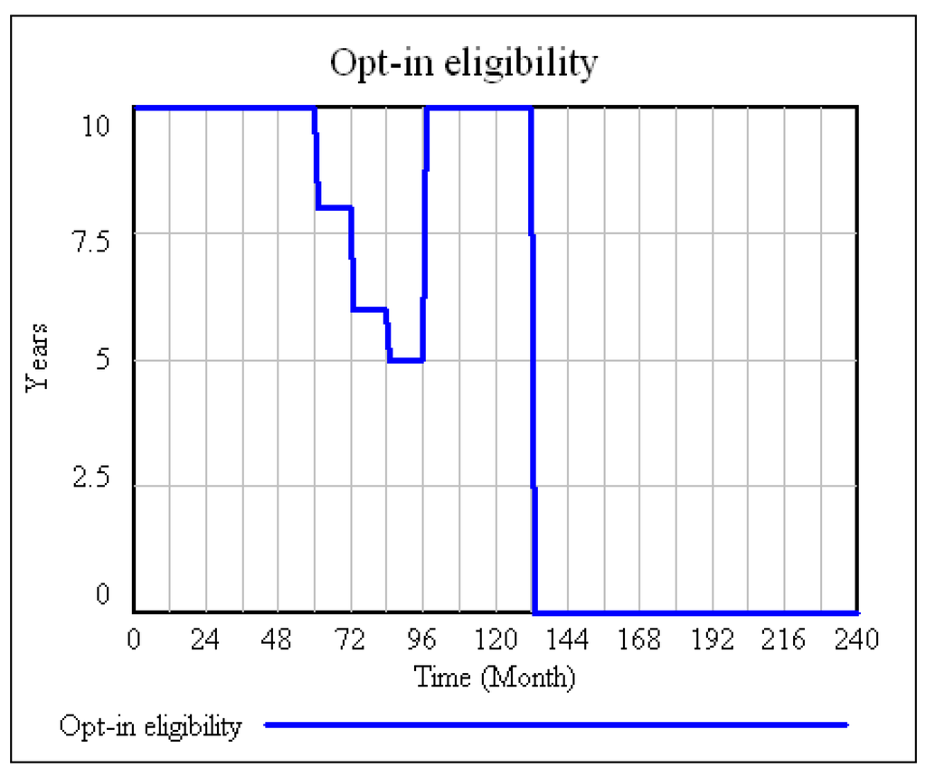 In the base case scenario, the opt-in eligibility declines to 8 years after the first 5 years (i.e., month 60) of the program when the market enters a slight oversupply situation (Figure 8).