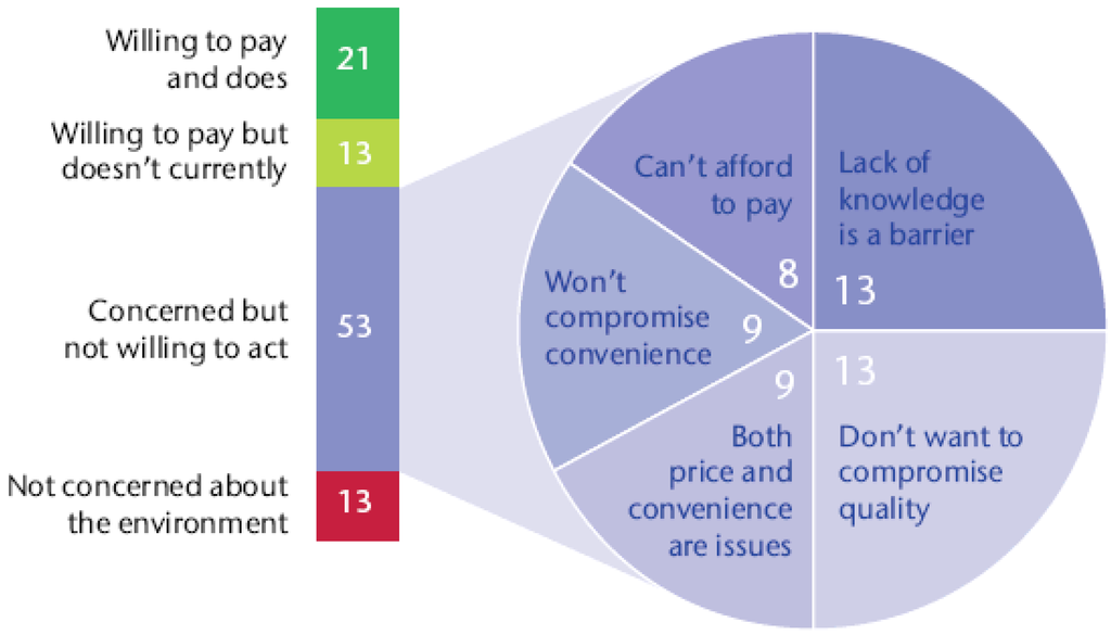 Regardless of significant changes in people’s choices, consumer willingness is not always converted into shifts in lifestyles. According to Young et al. [25], about 30% of consumers report that they are concerned about environmental issues but they struggle to translate this into greener choices. This phenomena is commonly known as the ‘attitude-behavior gap’, and is supported by a variety of studies that argue that enhancing knowledge and creating supportive attitudes often has little or no impact upon behavior [24,25,26,27]. Figure 1 shows the results of a survey conducted in Brazil, Canada, China, France, Germany, India, UK and the USA, concluding that 52% of consumers were concerned about environmental and social issues, but were not willing to pay for products with environmental and social benefits [24].