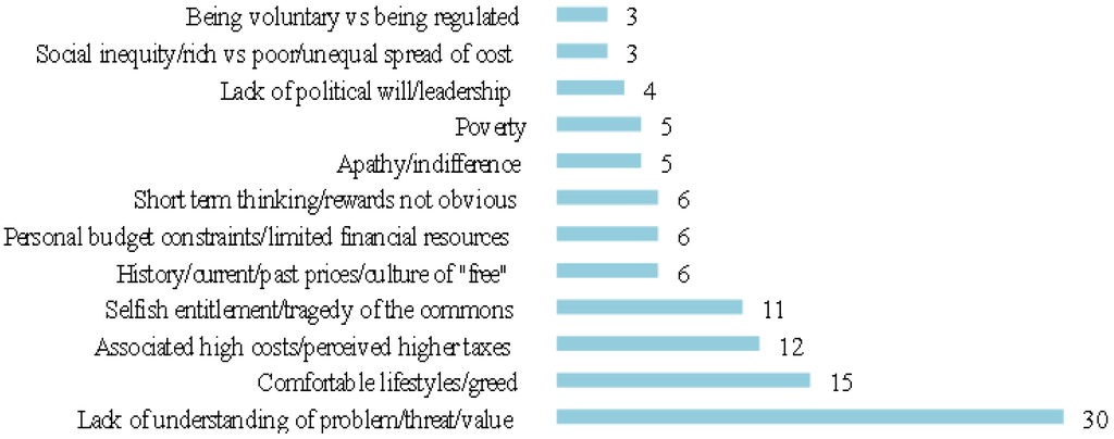 A worldwide survey on sustainable consumption [24] explored why consumers are sometimes unwilling to pay more for environmental performance, concluding that the four main factors for this inconsistency were related to lack of understanding, resigned lifestyles, selfishness, and associated costs and taxes. Figure 2 shows the factors that are believed, by a large group of cross-sectoral sustainability experts, to be the most relevant obstacles to an increased willingness to pay for the full costs of the ecosystem services that society uses.