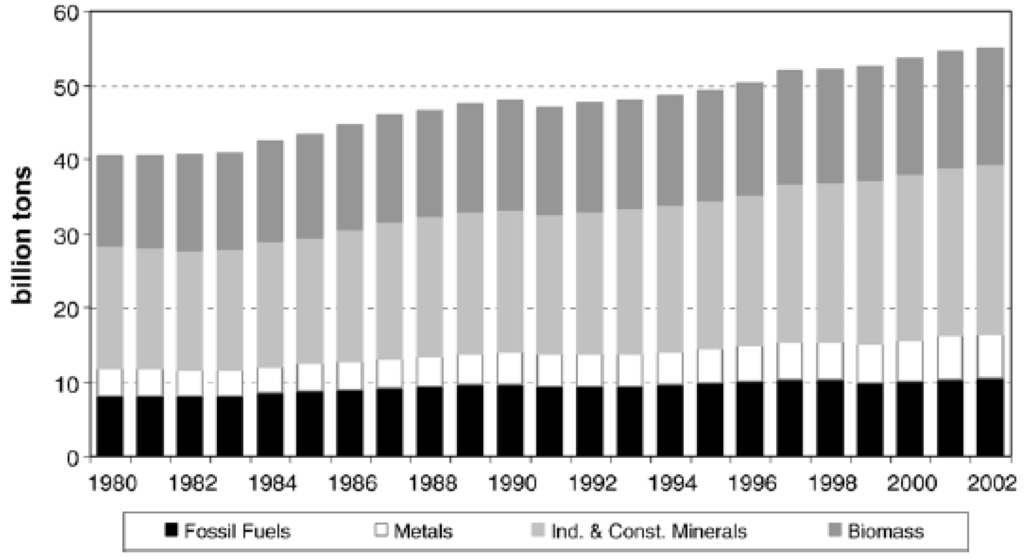 Global used resource extraction by material category (Fossil Fuels, Metals, Industry and Construction Minerals and Biomass; in billion tons) between 1980 and 2002. (Reproduced from [35], with permission from Elsevier).