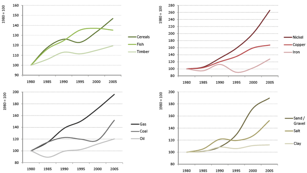 Global resource extraction trends of selected materials between 1980 and 2005 (in percentage, according to 1980 levels). (Reproduced from [36], with permission from Friends of the Earth).