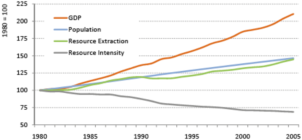 Although resource use has been growing, there have been significant improvements regarding the sustainable use of resources (e.g., worldwide diffusion of cleaner technologies and products; targeted policies and regulations) [33], which has actually permitted a relative decoupling of global economic growth from resource use, as shown in Figure 6. Between 1980 and 2005, worldwide resource extraction grew by around 50%, whereas the world economic output, measured by its Gross Domestic Product (GDP), increased by 110% in the same time period, showing that economic growth was higher than resource extraction, as a result of increased resource efficiency in relative terms [36].