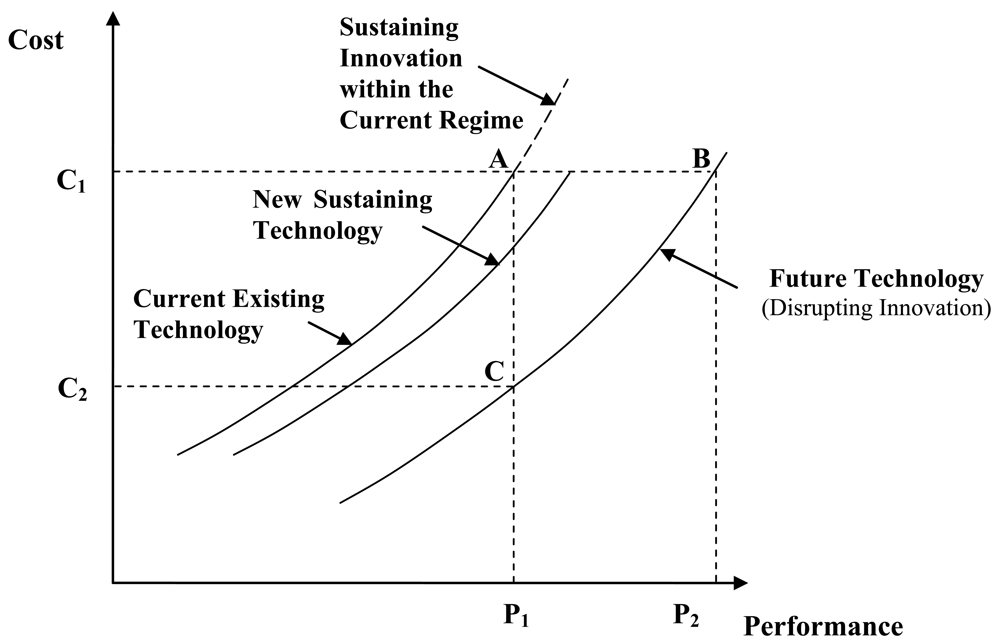 Another way of comparing sustaining and disrupting innovation is to depict three different pathways that innovation could take. In Figure 1, the various performance levels of an existing technology regime (for example, various internal combustion automobile engines with different fuel efficiencies) are shown as a function of cost. The most efficient existing engine is represented by point ‘A’ at cost C1. New improvements (sustaining innovations) to internal combustion engines can be developed within the same technological regime in several different ways. First improvements can be made, extending the performance of existing technology, but at higher cost, as depicted by the dashed line. Second, a significant innovation can occur within the same technological regime, giving rise to new performance-cost relationships as depicted in the second curve, shifted to the right in Figure 1. Third, a power system based on a different concept of innovation (a disrupting innovation) can be developed, represented by the ‘future technology’ curve, depicted by the right-most curve. At some point, fuel- efficient engines can be developed that provide the best old engine efficiency at a lower cost C2 (represented by point ‘C’) or better efficiency can be achieved at the same cost C1 (represented by the point ‘B’). Anywhere in between on the future technology curve represents a ‘win-win’ situation over the sustaining innovations on the dashed line.