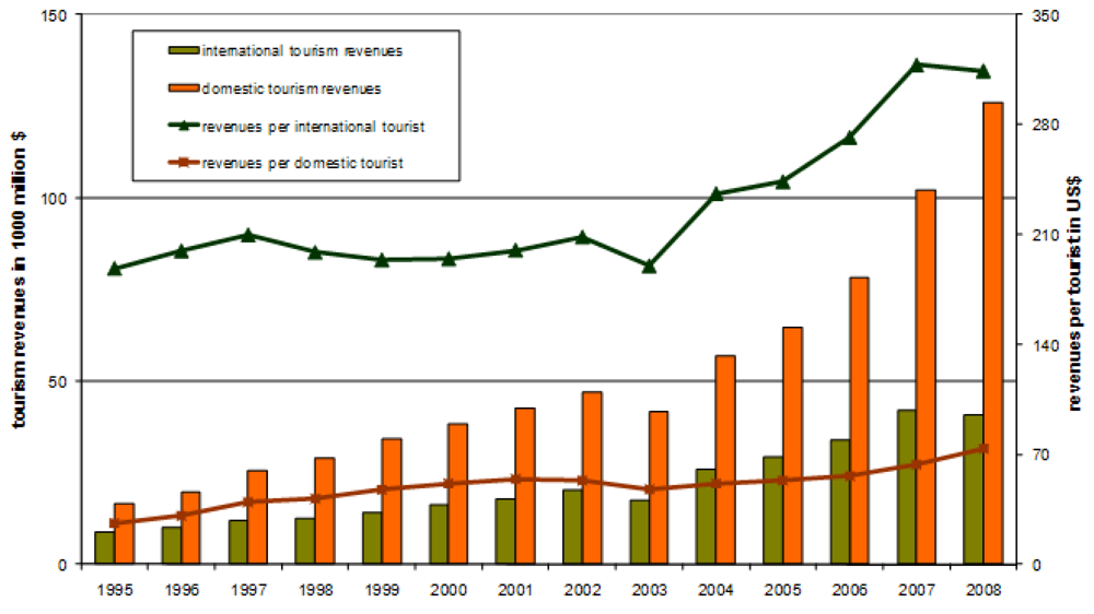 China has become one of the world's leading international tourism destinations [], having increased from 20 million tourists in 1995 to 57 million in 2010, ranking third after France, and USA []. In parallel to opening the door to foreign tourism [], domestic tourism has experienced an even more spectacular increase, from 629 million person-day in 1995 to 1712 million in 2008 [], underscoring the transformation of the country in the last two decades. Total tourism revenues in 2008 amounted to US$ 166.7 billion, representing 3.9% of China's GDP. Although revenues per tourist are higher for international tourists (US$ 314) when compared with domestic tourists (US$ 73), given the much larger size of the later, domestic tourism represents three quarters of the total tourism revenues (see Figure 1).