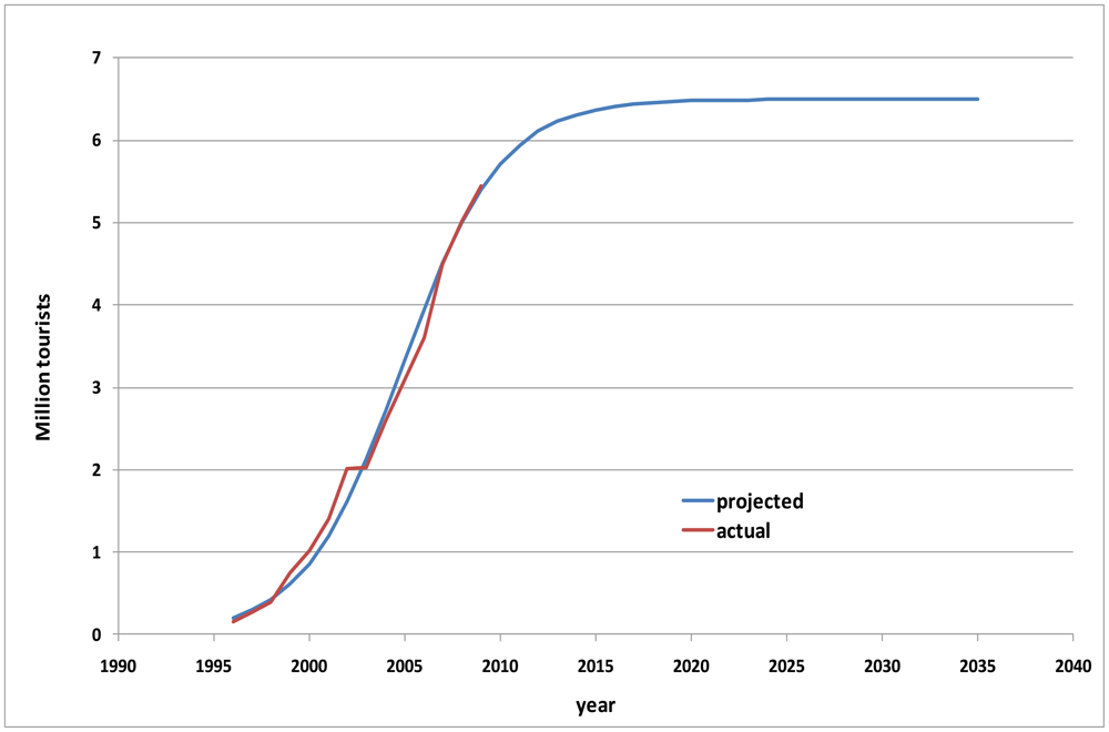 Based on 14 years data series, we have used non-linear regression models to explore future tourism trends in Anji. The assumptions are that after an initial fast increase in number of tourists, their growth will slow down and eventually level-off We used a parsimonious logistic regression with upper bound (K) change intervals of half a million tourists. The best fit (R2 = 0.988; P < 0.0001), represented in Figure 3, corresponds to a logistic model such as