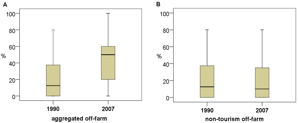 Access to off-farm income has become more widespread, as can be seen in Figure 4a. The coefficient of variation of the contribution of off-farm income in 1990 was 1.14, while this coefficient decreased to 0.61 in 2007. This indicates that new off-farm income opportunities are being seized by many families in the village. The coefficient of variation of off-farm, tourism-based income (0.97) is lower than that of off-farm-non tourism income (1.21), indicating that tourism is a more attractive and generalized option to generate off-farm income than other activities like construction or industry work.