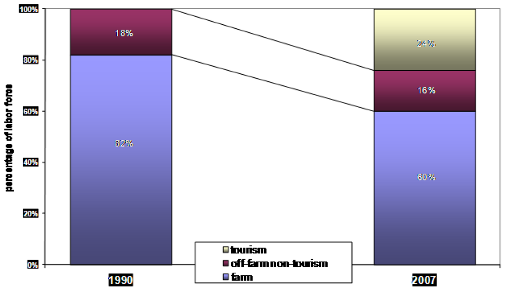 A fast increase in number of tourists coupled with higher per capita expenditures has meant a growing role of tourism in the county's economy. In 1996, tourism-based income contributed 0.4% of the total county GDP; this figure had increased to 4.4% in 2001, and it represented 13.8% of Anji's GDP in 2009 []. In fact, tourism has been one of the drivers to expand the tertiary sector at a county level and to allow farmers a significant increase in off-farm income at a local level as we will see later, thus confirming the generalized trend to non-farm based income development in rural areas exposed by Haggblade et al. [].