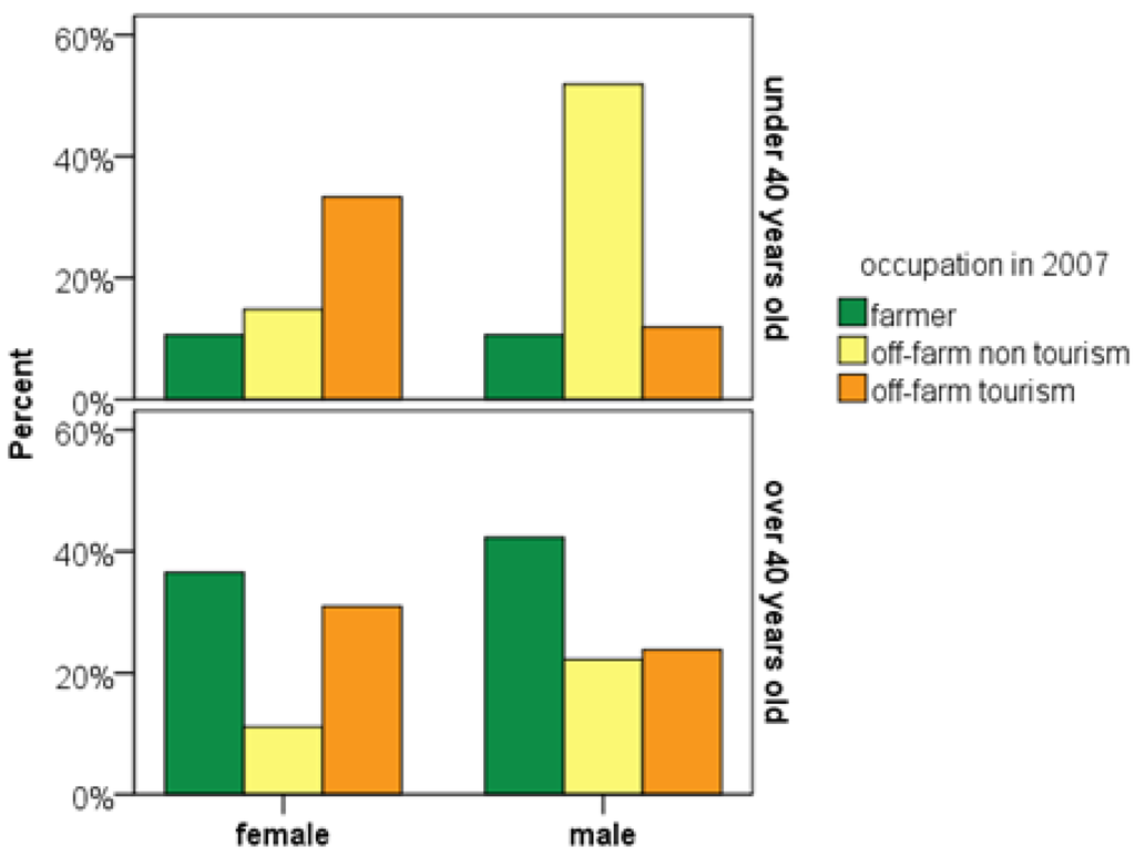 Consequently, labor allocation has also changed significantly during the period, with tourism accounting for 24% of total family labor in 2007 (see Figure 5). This is composed of 18% labor dedicated to rural hostels and catering (nongjiale) and 6% working on tourist shops. Age and gender have an influence on tourism-related labor opportunities. Being a relatively recent activity, the young generation (under 40 years old) has a significantly higher percent of labor on tourism and other off-farm activities than the older generation (χ2 = 22.817; p < 0.001). Women also devote more time to tourism-based activities than men (χ2 = 9.767; p = 0.008). However, this gender difference is only significant within the young generation, where women have specialized in the more home-centered tourism activities (nongjiale and shops) whereas men have searched for off-farm opportunities in trade, construction and forest industry sectors (χ2 = 9.807; p = 0.007). Higher education and the small-scale, family-based enterprise represented by most tourism activities have facilitated this process, as has happened in other areas of China []. For the generation over 40 years old, the gender differences in the three main types of activities are not statistically significant (see Figure 6).