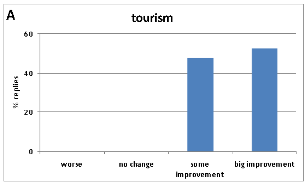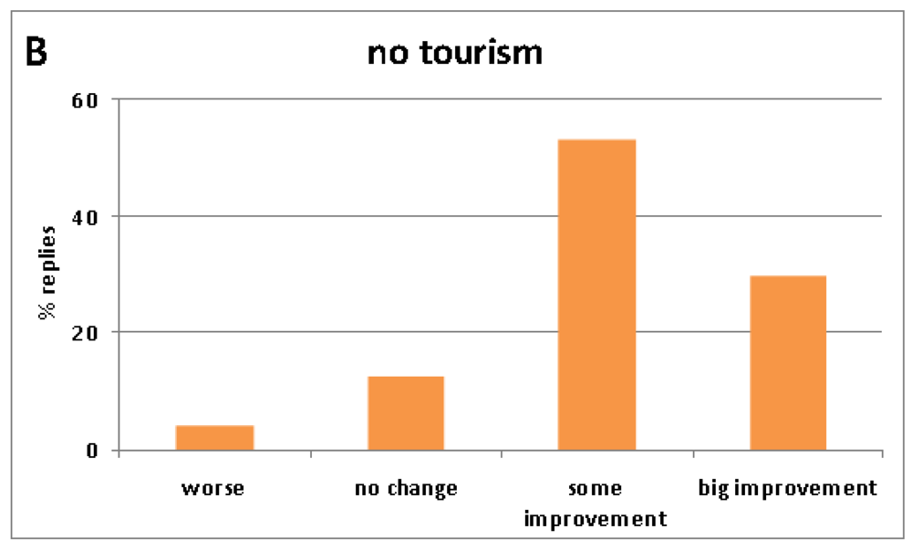 The farmers' survey included questions concerning changes in quality of life since 1990. The answers were recorded as a four rank ordinal variable from 1 (worse off) to 4 (significant improvement). The vast majority (88%) of those interviewed thought that their lives had improved somewhat or significantly; 9% of respondents felt that their lives had not changed; and only 3% thought that it had become worse. Farmers from the three hamlets that house the tourist activities tended to have a more positive view of changes (Kruskal-Wallis χ2 = 4.972; p = 0.026), suggesting a positive influence of tourism in general quality of life (Figure 7).