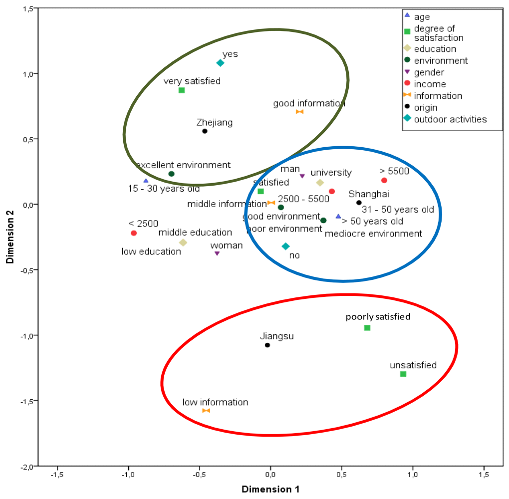 We have used the Categorical Principal Components Analysis to characterize different types of tourists depending on their attitudes, opinions, provenance and other personal features (see Figure 8). The first dimension associates income with age and education on the positive side, and the perception of environmental quality with the degree of satisfaction and outdoor activities on the negative side. The second dimension looks at information and outdoor activities versus age. The combination of these factors indicates that a high degree of satisfaction correlates with good information, a high appreciation of environmental conditions and a positive attitude towards outdoor, nature-related activities; this is classically associated with visitors from Zhejiang province. Tourists from Shanghai tend to be older, more educated and to enjoy a higher income; they are not particularly interested in outdoor activities, and have a variety of opinions about the environmental quality of the area. Finally, a poor level of satisfaction with the visit is associated with a low level of information, being relatively more common in tourists from Jiangsu and other provinces. Similar results related to preferences and behavior of visitors has been found in European protected areas [].