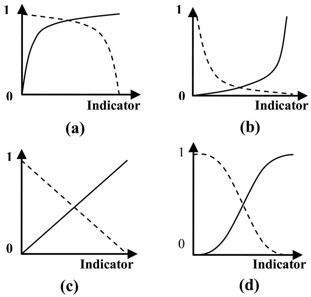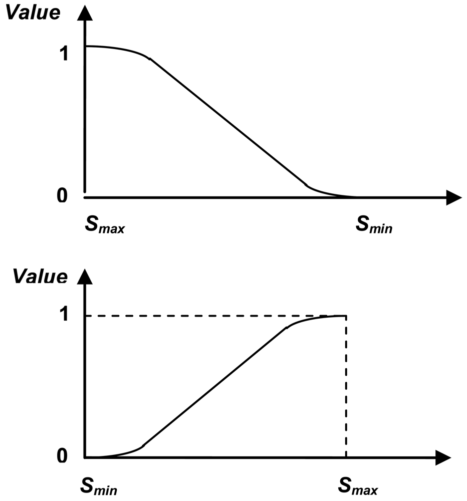 Defining the value function requires measuring preference, or the degree of satisfaction produced by a certain alternative option for a measurement variable (indicator). Each measurement variable may be given in different units; therefore, it is necessary to standardize them into units of value or satisfaction, which is basically what the value function does. The method proposed rates satisfaction on a scale from 0 to 1, where 0 reflects minimum satisfaction (Smin) and 1 reflects maximum satisfaction (Smax).