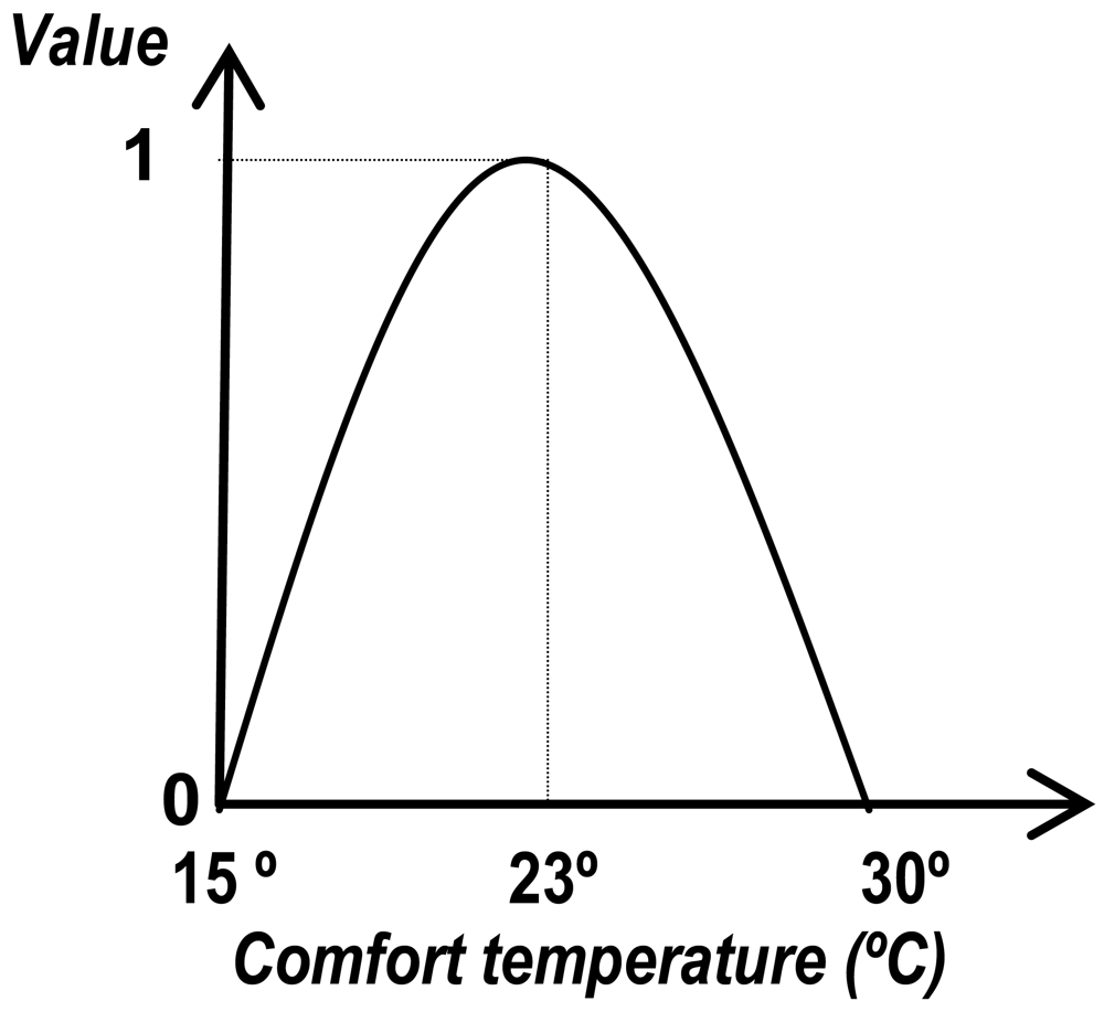 A linear value function is proposed for this indicator because the distance from the optimum temperature may be considered proportional to the corresponding dissatisfaction.