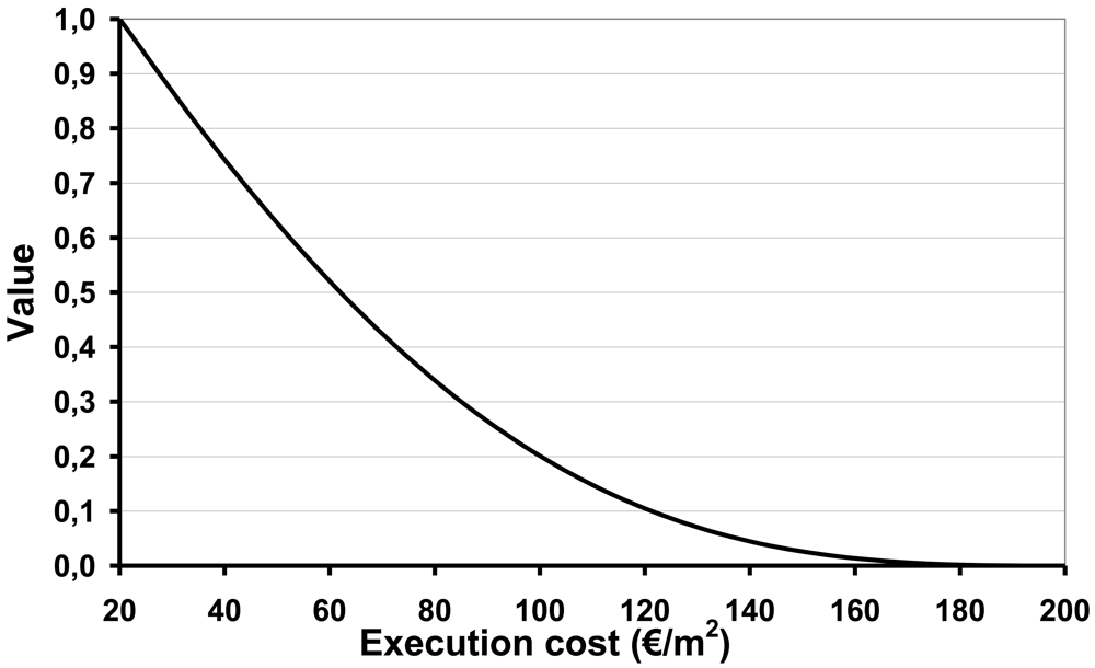 The points of minimum and maximum cost satisfaction in terms of €/m2 can be defined by experience with previous projects and by average market values. Typical values found for the cost of building different types of structures may vary between 20 €/m2 and 200 €/m2. Consequently, the minimum and maximum limits are set in this case at 20 and 200 €/m2 respectively. In more specific cases, smaller ranges can be defined. Cost is a typical indicator (generically with a high variability) in which the range can be adapted to the available alternatives. If this approach is adopted, the minimum and maximum costs would become the points of maximum and minimum satisfaction, respectively.