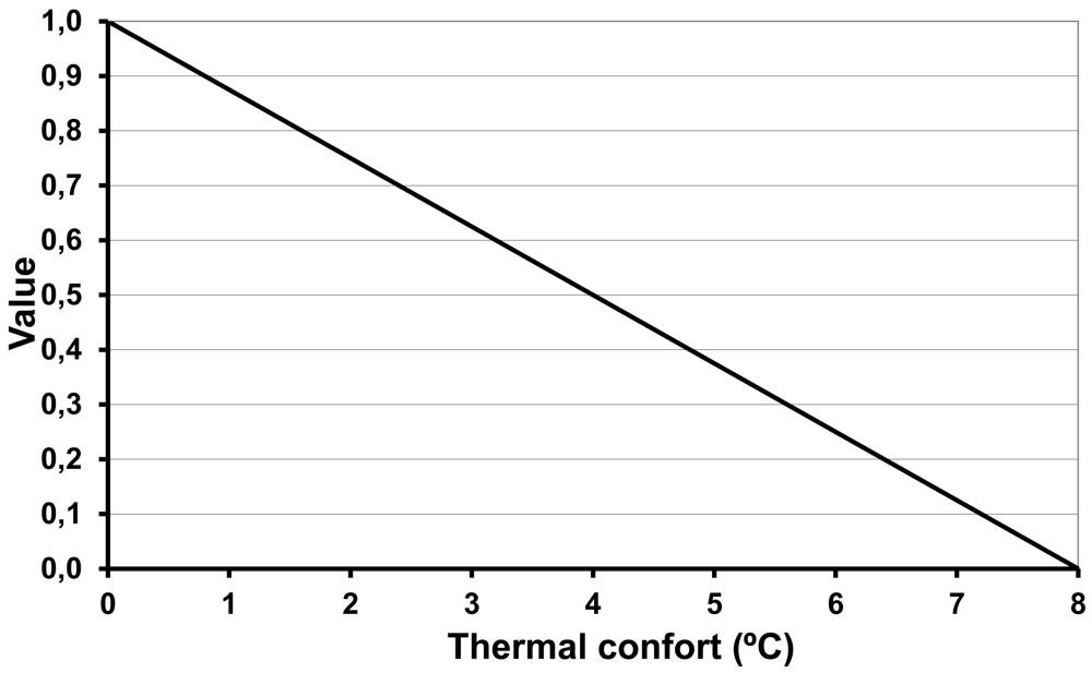 The range of values resulting from this transformation is 0–8 °C, where 0 °C corresponds to the maximum satisfaction since it is the most comfortable temperature with respect to the average (22−23 °C), while 8 °C represents the least satisfactory temperature as it is the furthest from the optimum temperature (23 − 15 = 8 °C)/(30 − 23 = 7 °C).
