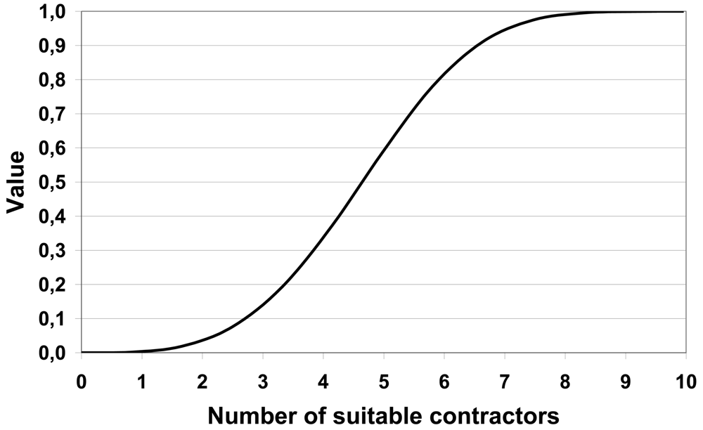 Based on these values, setting the points of minimum and maximum satisfaction at 0 and 10, respectively, is recommended. The first figure (0) would cover the case in which there are no suitable contractors. The second figure (10) takes into account that it is not usually realistic to have more than 10 candidates meeting the conditions of a contract.