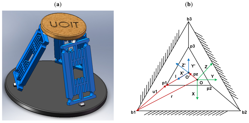 A kinematics model of the manipulator is shown in Figure 1(b). The vertices of the moving platform are pi (i = 1, 2, 3), and the vertices of the base are bi (i = 1, 2, 3). A global reference system O-XYZ is located at the center of the base. Another reference system O′-X′Y′Z′, called the moving frame, is located at the center of the moving platform. Note that Ob1 = Ob2 = Ob3 = r, and O′p1 = O′p2 = O′p3 = l.
