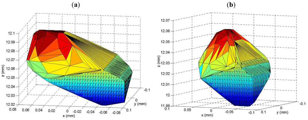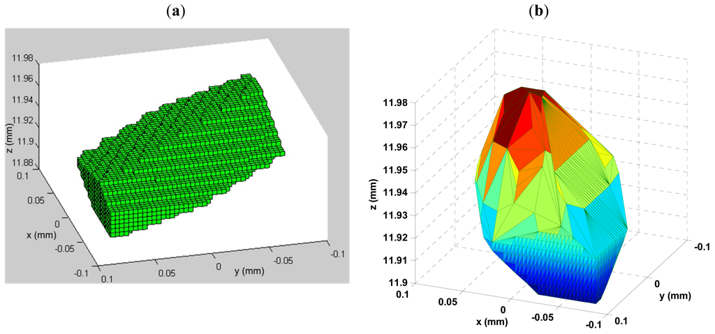 s9: In this step, since the moving platform is reaching the bound to the workspace, the algorithm terminates. Thus, generate and draw the workspace with the cubes (0.004 mm × 0.004 mm × 0.004 mm) in Cartesian coordinate system as shown in Figure 2(a).