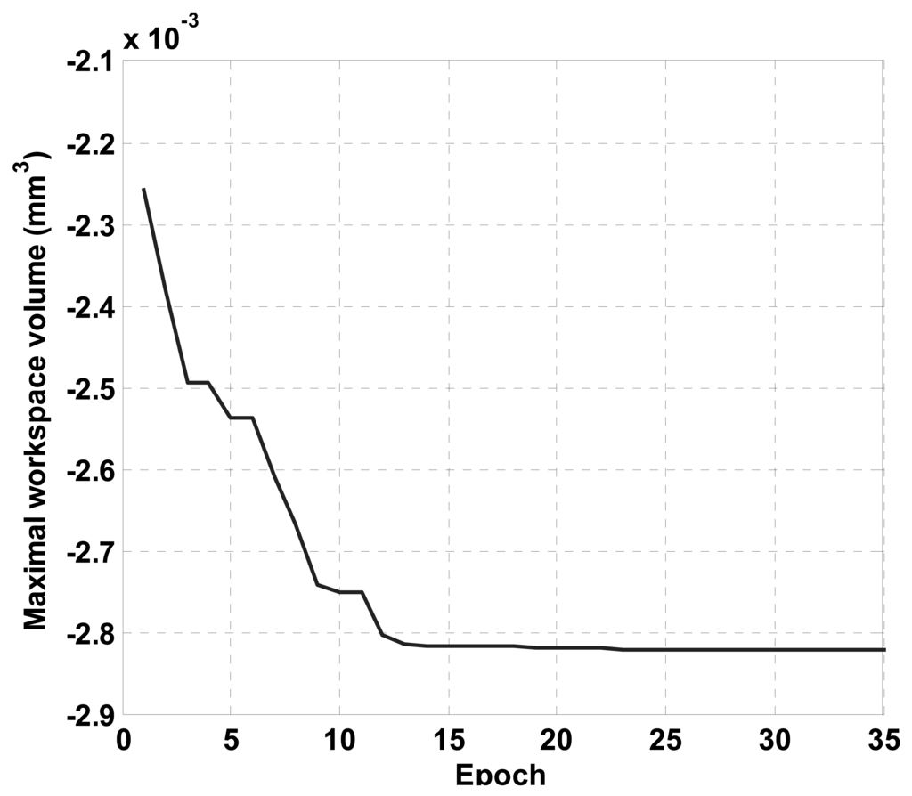 After optimization with 35 epochs, the volume of workspace is 2.82×10−3 mm3, improved by a factor of 5.2. The best individuals of the five parameters are: