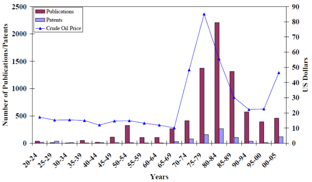 Interest in oil shale has waxed and waned. During the oil crises of the 1970s, the U.S. Government funded efforts to develop liquid fuels from oil shale. When oil prices dropped in the 1980s, projects were abandoned and companies saw their investments become worthless. Oil prices remained low most of the 1990s. As oil prices began to rise again in the 2000s, some energy companies expressed a modest level of renewed interest in the resource. Two barometers of interest in shale oil—the number of patents filed and the number of publications on the subject—illustrate this history (Figure 1).