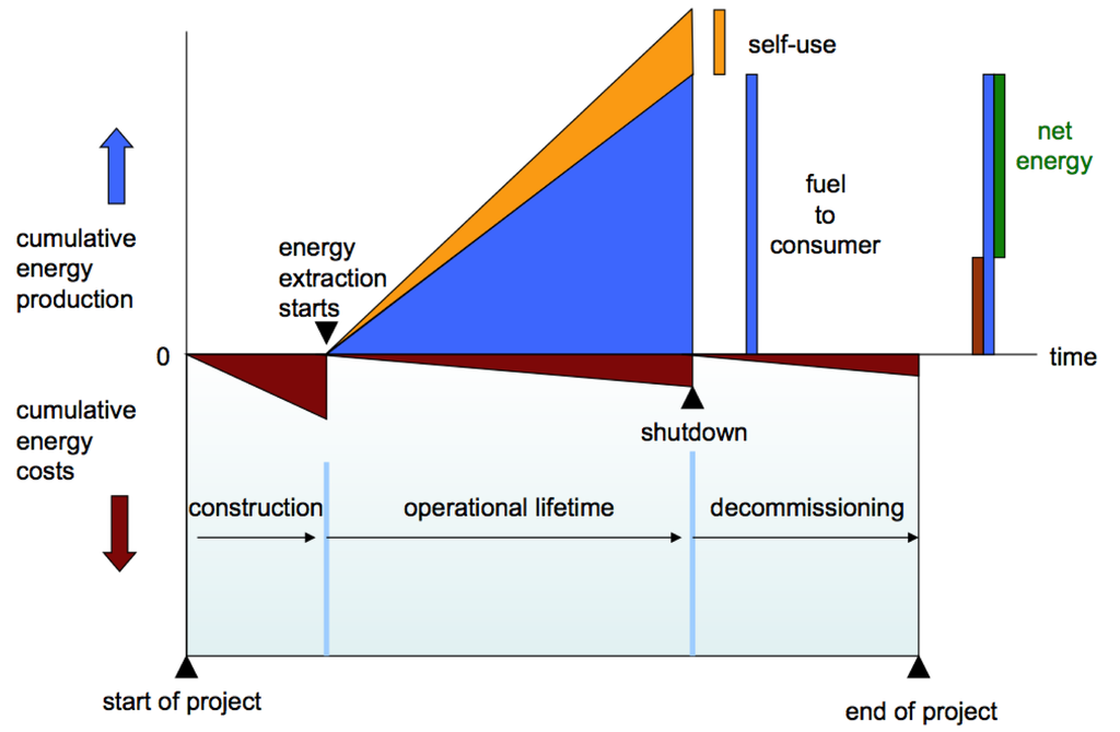 One technique for evaluating energy systems is net energy analysis, which seeks to compare the amount of energy delivered to society by a technology to the total energy required to find, extract, process, deliver, and otherwise upgrade that energy to a socially useful form. Figure 2 depicts a hypothetical energy system and the types of energy inputs (energy costs) and energy outputs (energy production) associated with that system. Figure 2 could refer to a single oil well or coal mine, a nuclear power plant, a wind farm, or an oil shale facility. The magnitude and timing of the energy production and energy costs are not intended to represent any particular energy system.