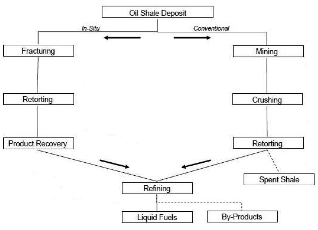 The kerogen in the shale can be transformed into petroleum through one of two primary processes. In surface retorting, the shale is mined, extracted, and processed. For in situ extraction, energy is applied to the shale while it is underground, with the kerogen converted into a liquid synthetic crude oil, pumped out, and refined. Both processes require a considerable amount of direct energy inputs, as well as water, capital and material inputs.
