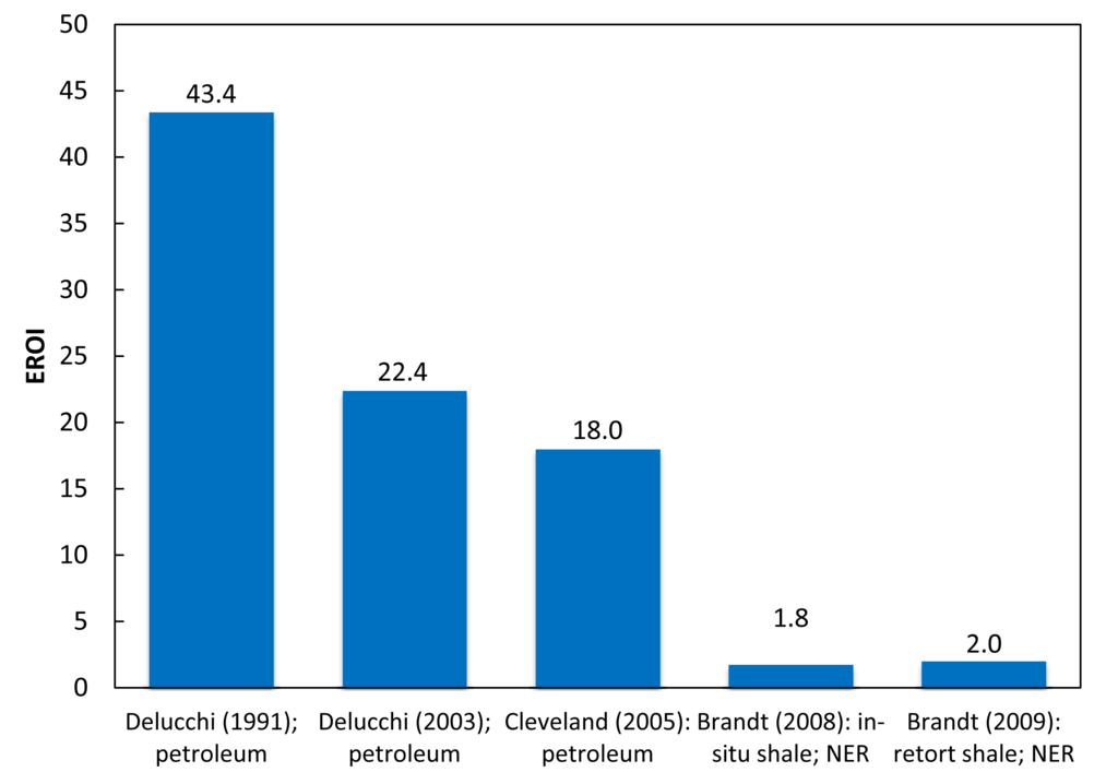 This places the EROI for shale oil considerably below the EROI for conventional crude oil. This conclusion holds for both the crude product and refined fuel stages of processing. Even in its depleted state—smaller and deeper fields, depleted natural drive mechanisms, etc.—conventional crude oil generates a significantly larger energy surplus than shale oil. This is not a surprising result considering the nature of the natural resource exploited in each process. The kerogen in oil shale is solid organic material that has not been subject to the temperature, pressure, and other geologic conditions required to convert it to liquid form. In effect, humans must supply the additional energy required to “upgrade” the oil shale resource to the functional equivalent of conventional crude oil. This extra effort carries a large energy penalty, producing a much lower EROI for oil shale.