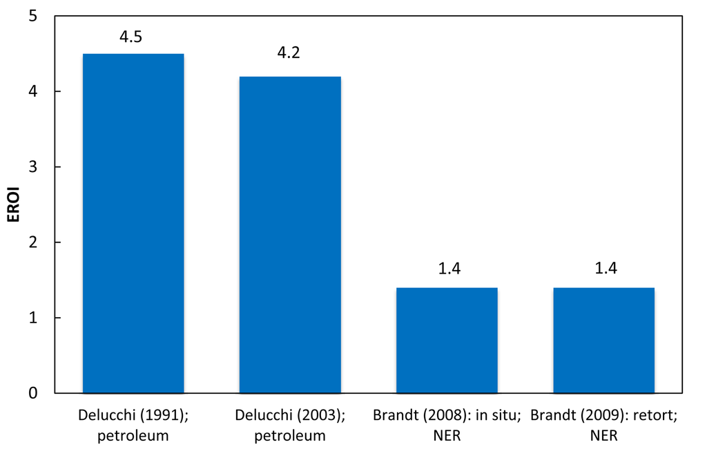 Bunger et al. (2004) [10] is not a specialized EROI analysis per se, and it does not contain a full calculation of indirect energy inputs or a quantitative assessment of all externalities. It also does not discuss the energy inputs required for in situ shale oil production. It provides a qualitative discussion of environmental impacts, with particular attention to how these compare to the impacts of production of petroleum from oil sands.