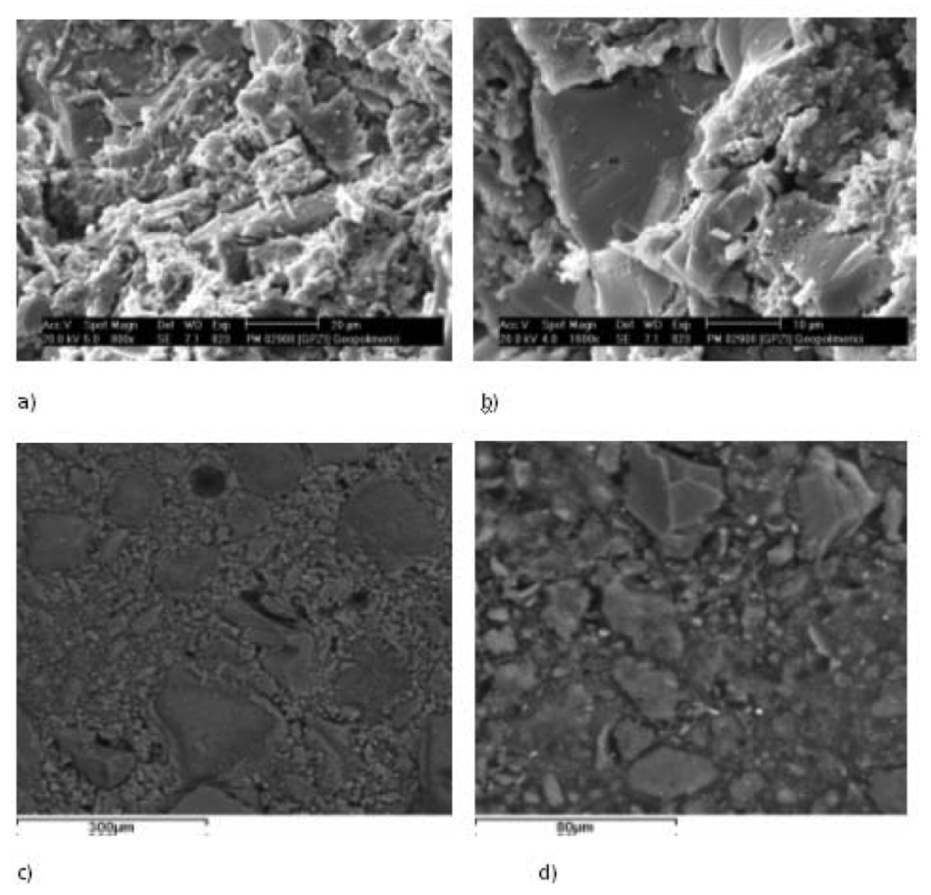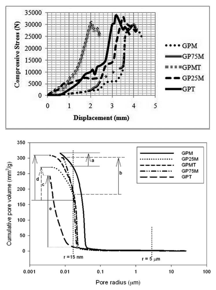 Despite the relatively high cumulative pore volume, gel pores present in the microstructure strengthen the matrices (Figure 4) [29]. Al-rich based geopolymer materials (GPM, in Figure 4) have matrices with larger pore size and high porosity that can be controlled by the introduction into the system of Si-rich metakaolin (GPT) as substitute to Al-rich clay with the final effects of reducing pore size and development of more dense structure.