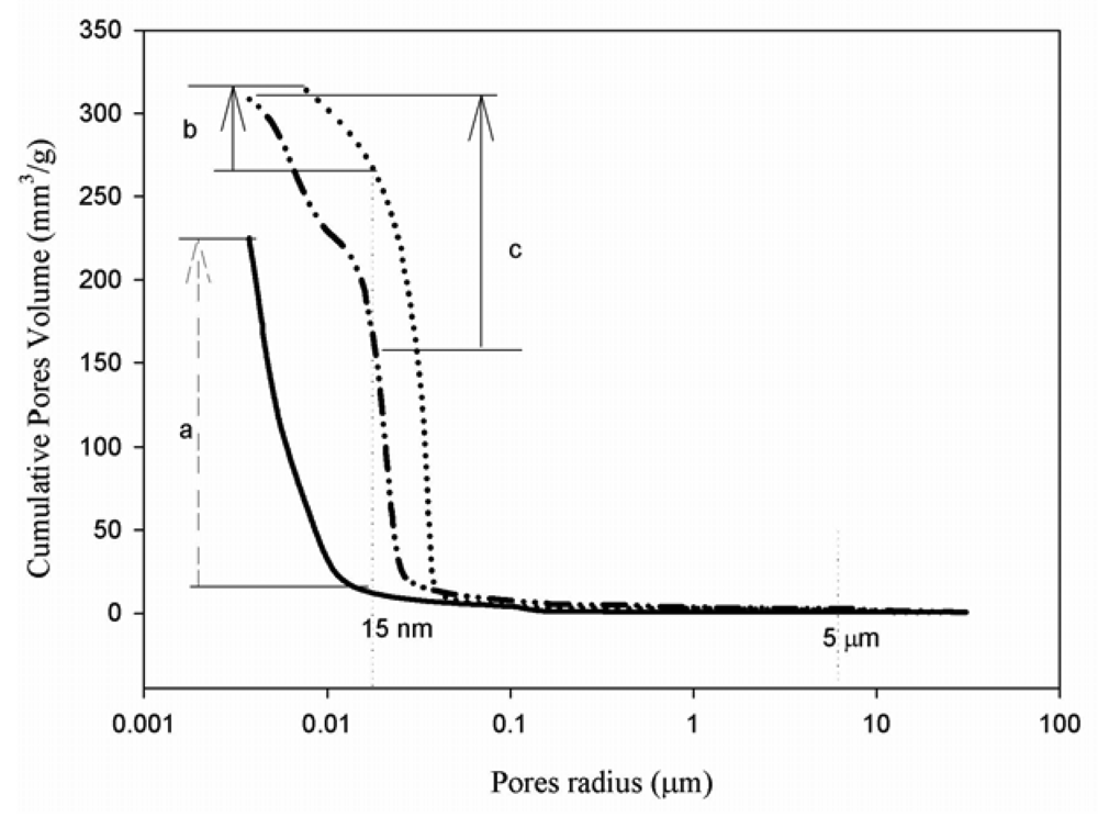 The thermal history of the aluminosilicates used will also affect the rate of dissolution and polymerization, time taken to achieve a stable matrix and the volume fraction of effective geopolymerization. It can therefore be inferred that this property will directly influence on porosity, pore size distribution, permeability and engineering properties (Figures 1, 2, 3). These are important features of the geopolymeric microstructure, which directly influence engineering properties [25,26]. It is generally accepted that the strength of any given mortar is fundamentally a function of the form and distribution of voids space and porosity. This strength is influenced primarily by the pore size distribution rather than by the cumulative pore volume (Figure 3). Gel pores diameters that are less than 15 nm are too small to initiate cracking under relatively low stress and therefore do not detract from the strength of the mortar [20]. The cumulative pore volume and pore size distribution are directly affected by Si/Al, and especially by alumina content (Figure 2). A minimum Al2O3 content of 10 to 15 wt % in raw materials that are essentially aluminosilicate 3D matrix formation assure good strength values, sometimes exceeding 30 MPa [27-29]. The average pore size is usually below 15 nm—his is linked to gel pores that are greater than 50%. With an increased amount of alumina content, the compressive strength can increase by as much as 22 wt %. Compressive strength values can exceed 120 MPa when optimized composition and synthesis technologies are applied.