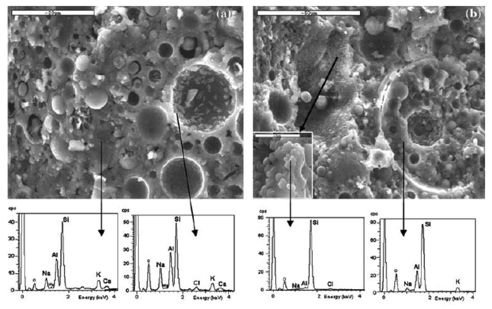 Figure 3 shows micrographs of fly ash-based geopolymer materials as produced, and after exposure to hydriochloric acid solution [21]. EDS results confirm that the material's high resistance to acid attack and its stability can be linked to the relative high Si/Al ratio and the dense structure of the matrix.