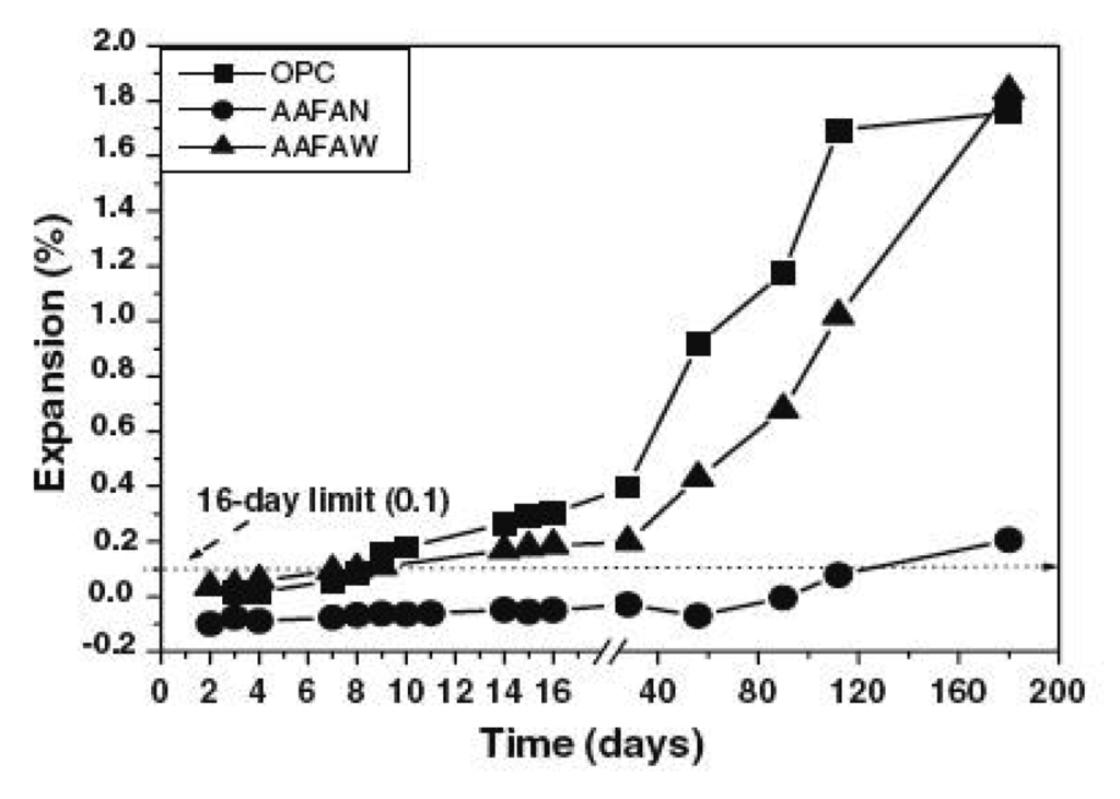 A key advantage of using geopolymers is the desirable impact they have on the durability performance of the resulting cementitious composite. This is linked to their dimensional stability, especially in geopolymer compositions with very low C-S-H (Figure 5) [29]. In fly ash-based and other amorphous aluminosilicates materials, such as metakaolin and volcanic ash with low Calcium content, the primary reaction is the alkali activation of the amorphous aluminolisicates. This essentially leads to the formation of polysialates (M-A-S-H). The secondary reaction is the attack of aggregates by the alkali, but in the absence of calcium, this will not be significant.