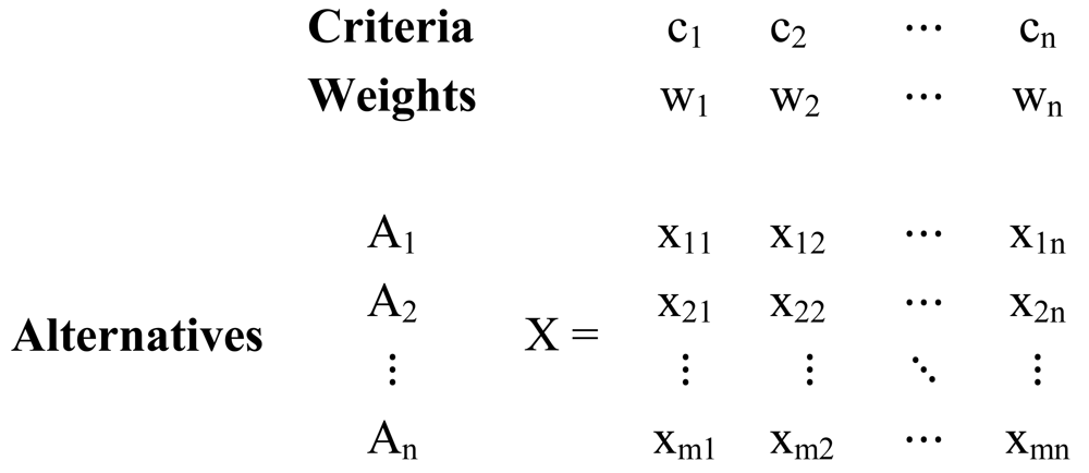 MCDA is an operational evaluation and decision support system that is suitable for addressing complex problems featuring high uncertainty, conflicting objectives, different forms of data and information, multiple interests and perspectives, and including complex evolving bio-physical and socio-economic problem [61-66]. It has long been widely applied to economic, social, and industrial systems. An MCDA in general involves m alternatives (e.g., bioenergy systems) evaluated on n criteria (i.e., sustainability criteria), in which each of j-th criteria C of i-th alternative A has performance of xij. Each criterion is weighted, and wj is the weight of criteria j. The grouped (i.e., stakeholders) decision matrix X can be expressed as seen on Figure 2.