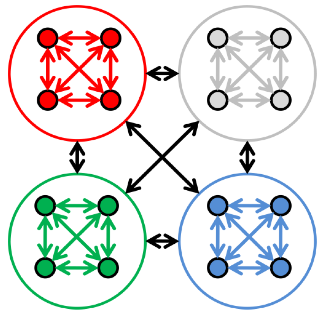 ABM model is a computer representation of the considered system that is comprised of multiple, interacting actors (i.e., agents) [92]. ABM systems possess two distinct properties: (1) the system is composed of interacting agents; and (2) the system exhibits emergent properties, that is, properties arising from the interaction of the agents that cannot be deduced simply by aggregating the properties of the agents [93,94]. ABM can be used to model the interactions of agents or sub-systems using the metrics, variables and indicators as performance measures. Figure 4 provides schematic illustration of an agent-based system: each of the four circles represents a sub-system of agents (e.g., companies) denoted by small dots and the whole arrows show how agents and sub-system of agents are interacting with each other. Interacting agents and sub-systems, though driven by only a small set of rules which govern their behaviour, account for complex system behaviour whose emergent dynamic properties cannot be explained by analyzing its component parts [92]. Therefore, ABM aims to look at global consequences of individual or local interactions in a given geographical area.