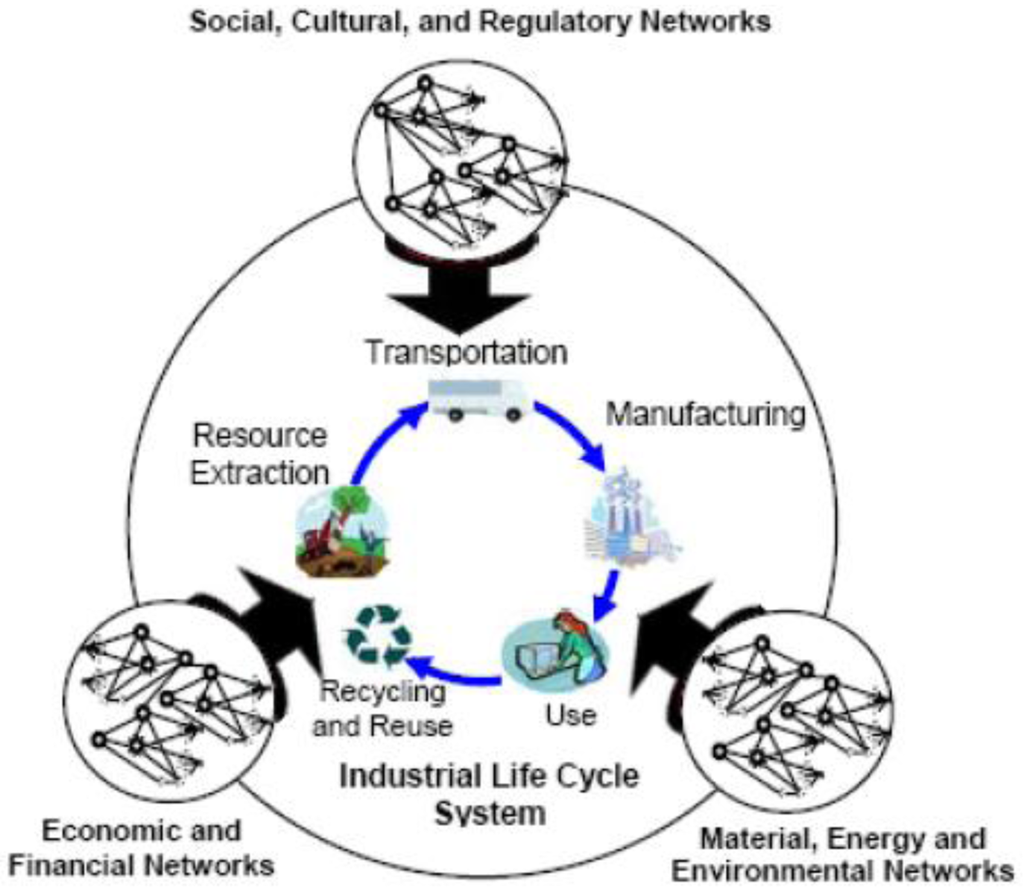 Though SNT can overlap with SD, it is important to note that these methods are complementary to each other. SNT models the understanding and visualization of a complex system by conceptualizing it as a network. A conceptual SNT framework made up of a social, cultural and regulatory network; an economic and financial network; and a material, energy and environmental flow network is shown in Figure 5. The theories of networks and network analysis have been widely applied providing a unifying language to describe disparate systems ranging from social interactions to power-grids [118-120]. Kim [120] showed an SNT framework for industrial systems which are understood in a holistic sense to include social and industrial dimensions, manufacturing and service components, and consumption and end-of-life activities. Thus, the science of networks is a promising vehicle by which to study, and advance our understanding of complex systems that are at the heart of sustainability science and engineering. Network theory and analysis can support identification of causal loops (in the case of system dynamics), help with prioritization of conflicting factors (such as in MCDA), and facilitate policy intervention and implementation at the right levels.