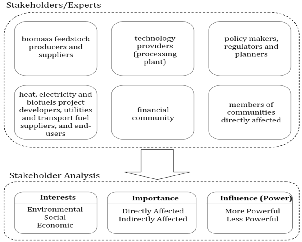 Figure 6 shows a cradle-to-grave supply chain of biofuels while considering the impacts representing the triple dimensions of sustainability. Social and ecological impacts are the direct inevitable consequences of biofuels system development. The current study has adopted the key criteria (which are converted into relevant variables and parameters) identified in the works of Buchholz et al. [130,131] on sustainability criteria for bioenergy systems. The study analyzed how key bioenergy stakeholders and experts perceived the list of 35 initially identified sustainability criteria for bioenergy (as shown in Table 1) found in emerging sustainability assessment frameworks [1]. Using AHP, participants were asked to rate each of the 35 criteria on four attributes including relevance, practicality, reliability, and importance. Similar to Buchholz et al [131] and Elghali et al. [5], through stakeholders' analysis of bioenergy production, the range of stakeholders involved are broad and identified in Figure 7.