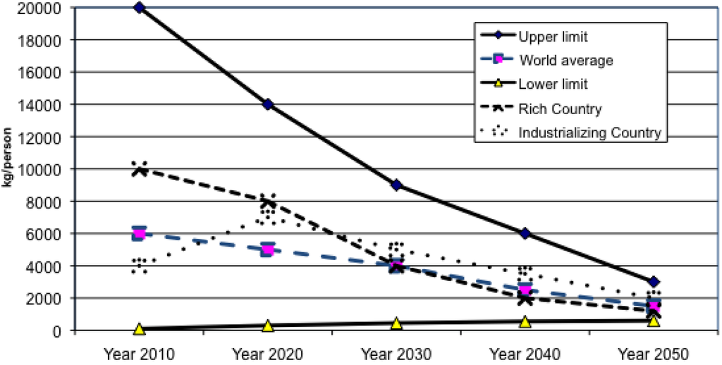 For reasons of clarity and mutual understanding the global 2 °C ceiling is best translated in individual parties' annual emissions per person “contraction and convergence” trajectories from 2010 to 2050 (Figure 1). Every trajectory is subject to the constraint of the “Upper limit” of the funnel. Figure 1 also shows a “Lower limit” to express that development of poor countries should not be truncated because their emissions increase; although the natural lower limit is simply zero (the abscissa). Even a line below the abscissa is plausible when including carbon dioxide capture and storage of bio fueled combustion emissions [32]. A world average, as shown in Figure 1, may function as a useful reference during negotiations.